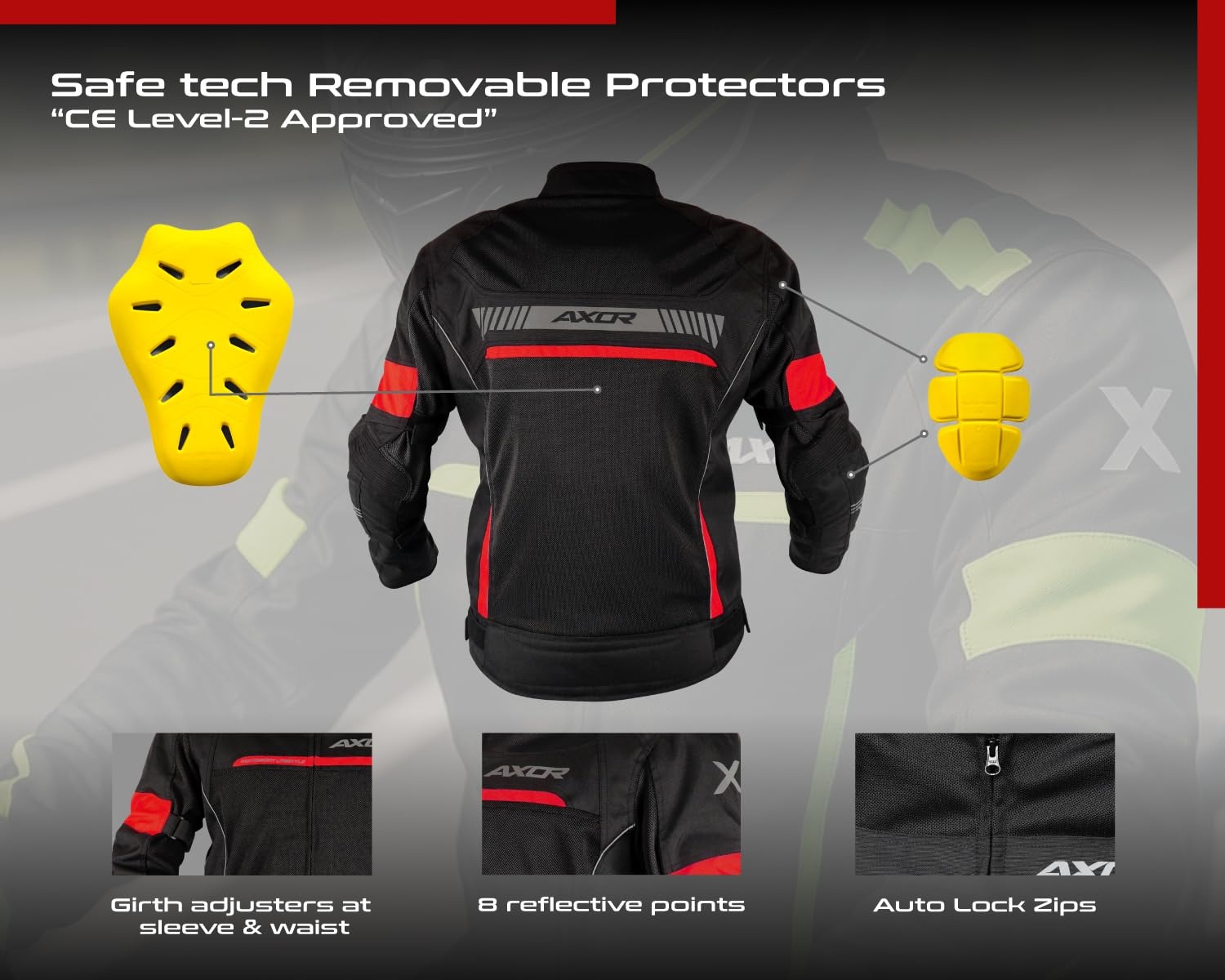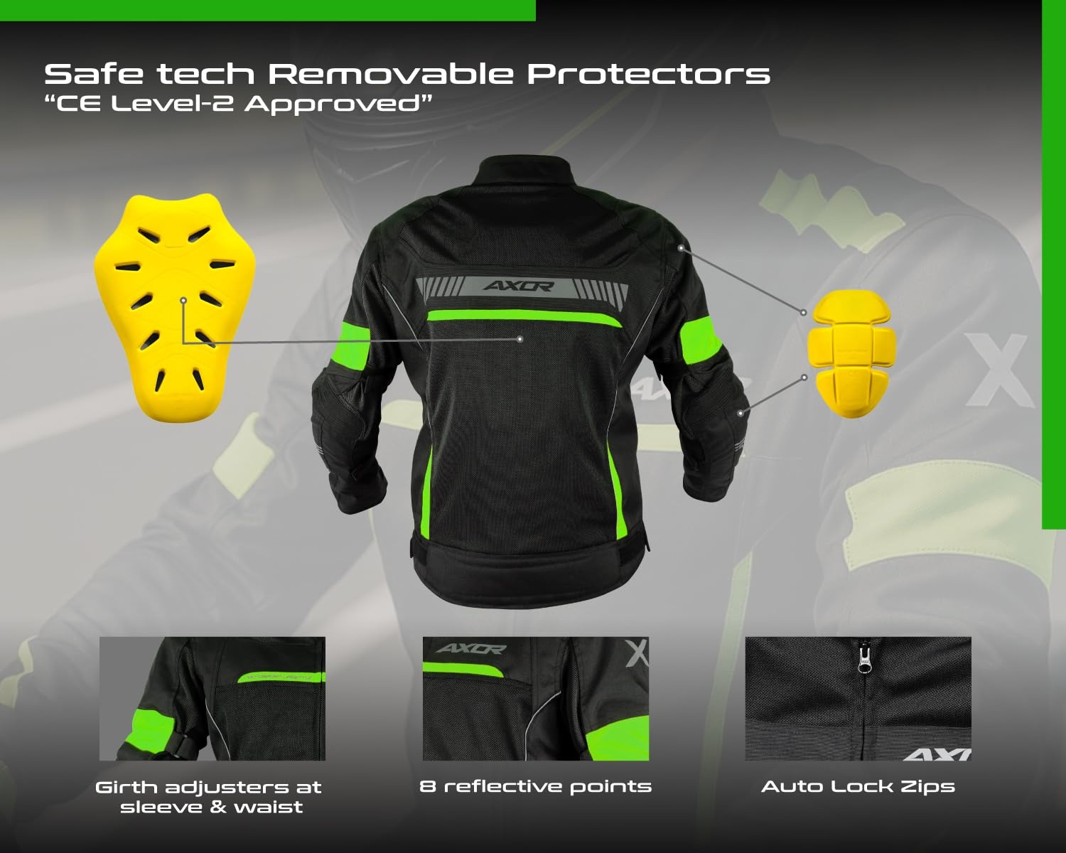 - Safe tech Removable Protectors “CE Level-2 Approved” on the Shoulder, Elbow & Back. 3M Scotchlite Traditional Polarization Reflectors (TPR) Reflector at 8 technically located reflective points for low light visibility